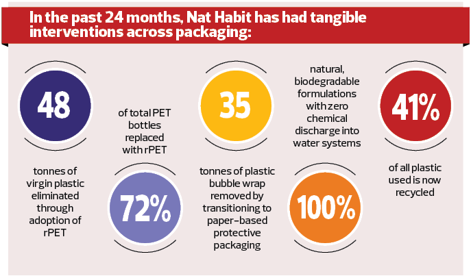 To exemplify, Nat Habit released its first Sustainability Impact Report on 2 December. Das believes reaching the INR 250-crore revenue mark was a meaningful inflection point for Nat Habit. Swagatika Das, cofounder and CEO at Nat Habit, expresses, “Over the last 24 months, we’ve transitioned 72% of our PET bottles to rPET, eliminated 35 tonnes of plastic bubble wrap, introduced biodegradable paper packaging, and strengthened zero-pollution manufacturing.”