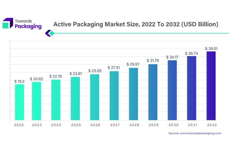 The global active packaging market is projected to grow from USD 19.2 billion in 2022 to an estimated USD 39.51 billion by 2032, with a 7.5% CAGR. A report by Towards Packaging
