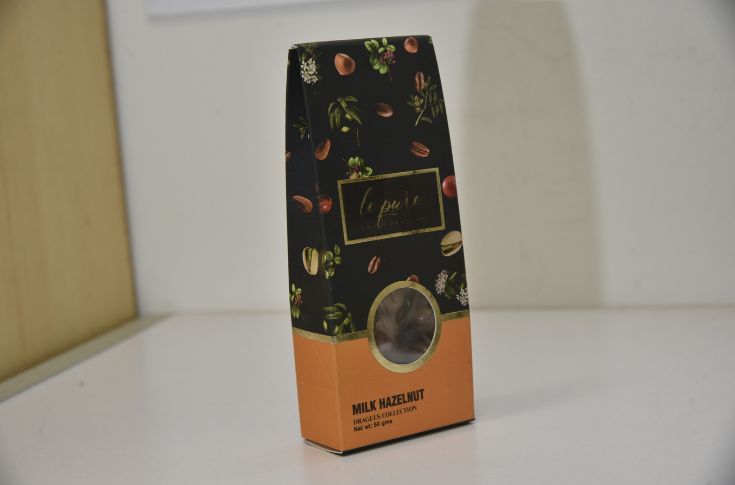 Aesthetically pleasant paper-based packaging with a window. Packaging comprises two components: pouch and outer box with a window. The pouch is made up of transparent PET/POLY and the outer box is made of 400gsm paper. The window provides an enticing view of the chocolate inside, making it look delicious and appealing potential to customers. The window size on the pack is appropriately seized and placed without compromising the structural integrity of the box. The complete pack is sturdy enough to protect the chocolate from external factors like light, temperature, handling,and transportation.