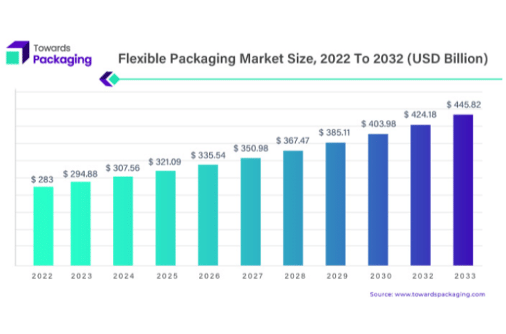 The global flexible packaging market continues its upward trajectory. As per a report by Towards Packaging, the market was USD 283-bn in 2022 and will be USD 445.82-bn by 2032. Towards Packaging is a leading global consulting firm specializing in providing comprehensive and strategic research solutions across various industries