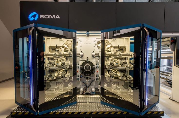 Soma Optima 2 is a surface or reverse printing flexo printing machine on varied substrates including paper, films and aluminium. The machine performs on flexible or paper packaging, printing and converting including shrink sleeves. It is aimed at the complete range of packaging printing markets.