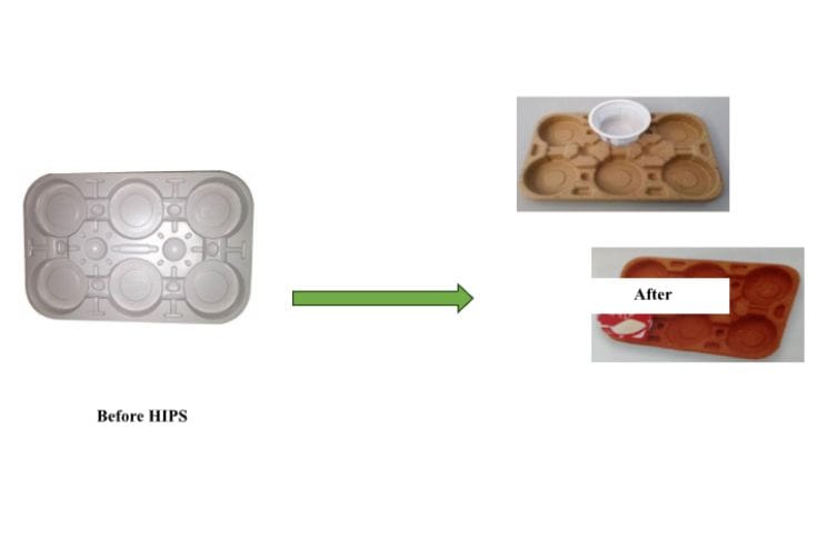 HIPS is a thermoplastic polymer made from styrene monomers. It is a type of plastic known for its rigidity, strength, and impact resistance. HIPS trays are typically rigid and have a smooth surface. Pulp-moulded trays are made from fibrous materials, such as recycled paper, cardboard, or agricultural waste. They are typically formed by molding a mixture of pulp and water into the desired shape and then drying it.