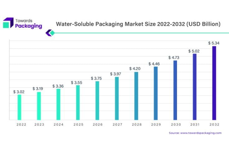 The global water-soluble packaging market size was at USD 3,020-million in 2022 to hit approximately USD 5,340-million by 2032, registered at 5.9% CAGR projected between 2023 and 2032. A report by Towards Packaging highlights the shift towards eco-friendly solutions with water-soluble packaging