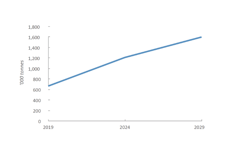 The new market report from Smithers – The Future of PCR for Food-grade Applications to 2029 – shows that surging demand from food and drink brands has caused the market to grow at an annual rate of over 9% since 2019. A compound annual growth rate (CAGR) of 9.2% is forecast for 2024-2029, pushing consumption to 1.6 million tonnes in 2029.