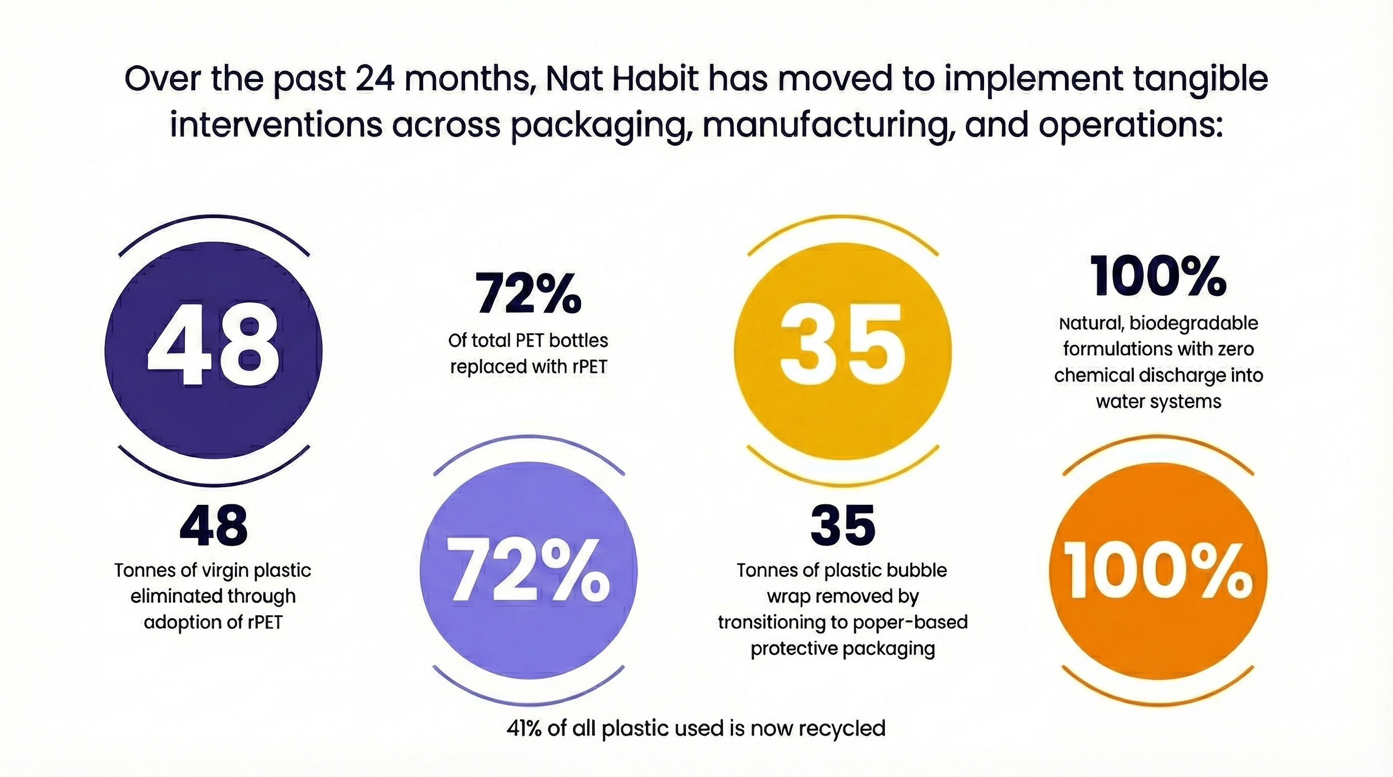 The company released its first Sustainability Impact Report on 2 December. Swagatika Das, co-founder and CEO at Nat Habit, expressed, “Over the last 24 months, we’ve transitioned 72% of our PET bottles to rPET, eliminated 35 tonnes of plastic bubble wrap, introduced biodegradable paper packaging, and strengthened zero-pollution manufacturing.”