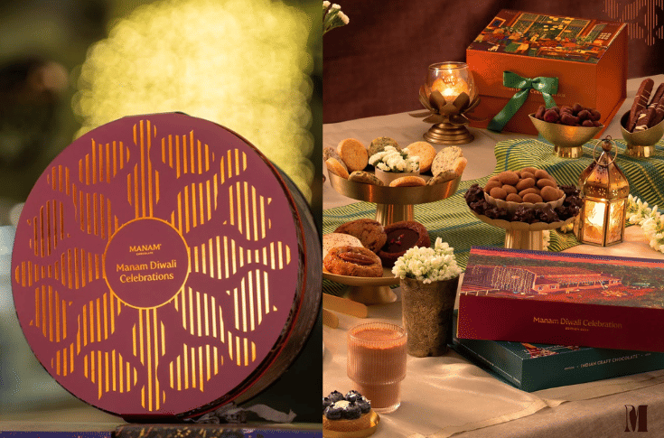 For premium brands like Manam Chocolate, the Diwali gift box is not just a vessel for sweets — it is a narrative experience. The 2025 limited-edition packaging, designed by Anomaly Brands with artwork by Namrata Kumar, depicts the cacao farms of West Godavari and festive celebrations in urban India.