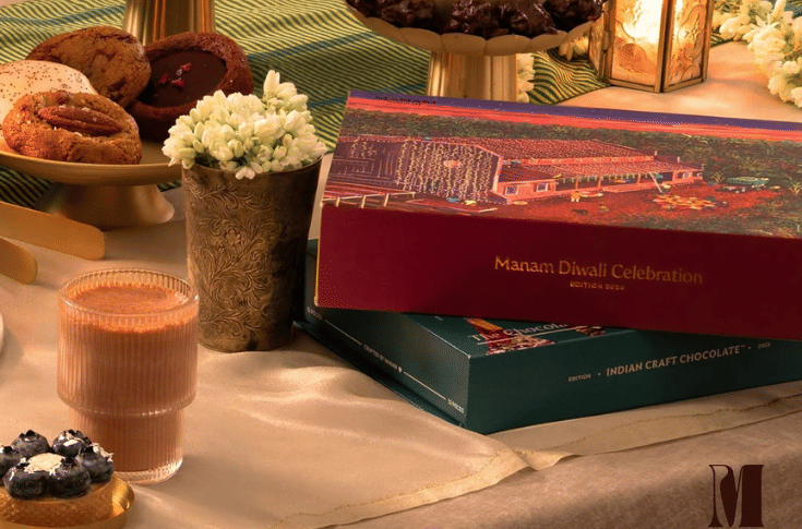 For premium brands like Manam Chocolate, the Diwali gift box is not just a vessel for sweets — it is a narrative experience. The 2025 limited-edition packaging, designed by Anomaly Brands with artwork by Namrata Kumar, depicts the cacao farms of West Godavari and festive celebrations in urban India.